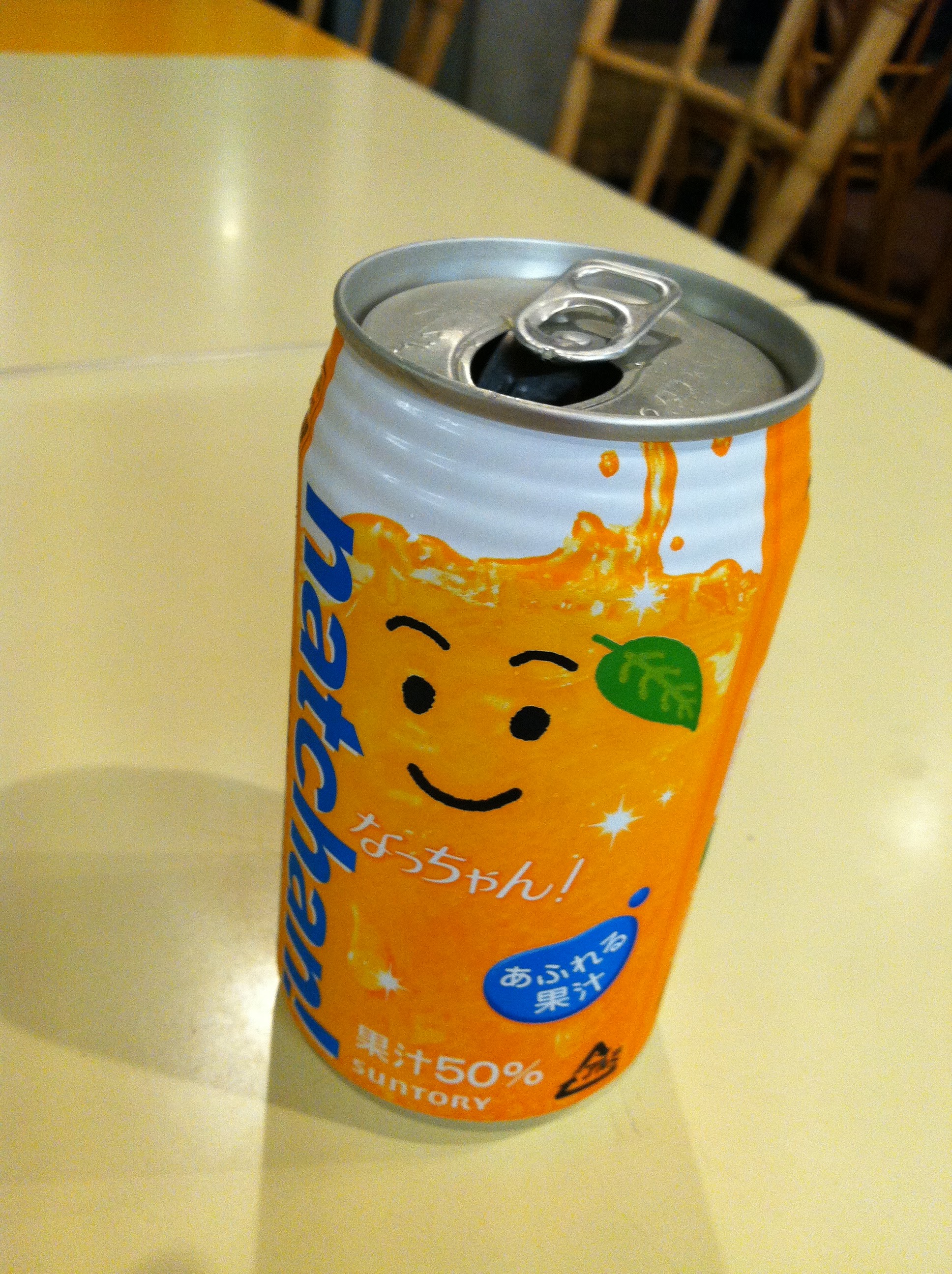 I haven’t had water since the plane, and I spot one of the fabled Japanese vending machines in the hostel kitchen. I recognize nothing in it, so I purchase this orange beverage, coz he looked friendly.