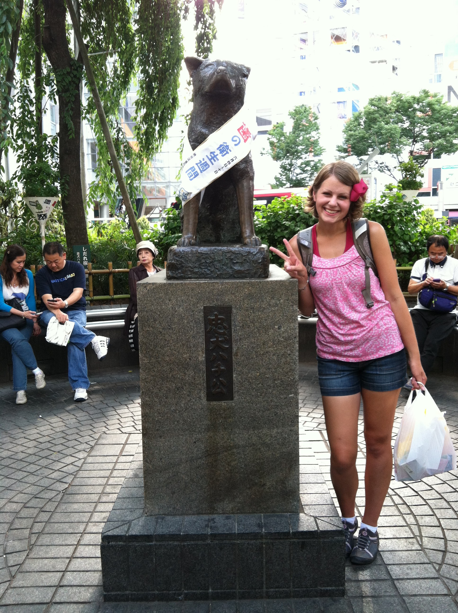 We exit the Starbucks and go experience the crossing for ourselves again. Just after Rita takes a photo of me with the statue of Hachiko, the three of us find ourselves cornered by a film crew from NHK. They are interviewing tourists and want to know how long we have each been in the country. Rita says “one year”, Sandra says “since high school”. I say “two days”, and watch my poor friends practically elbowed aside as the crew surrounds me with cameras and microphones.